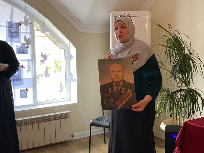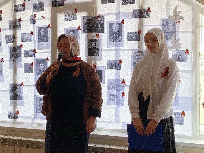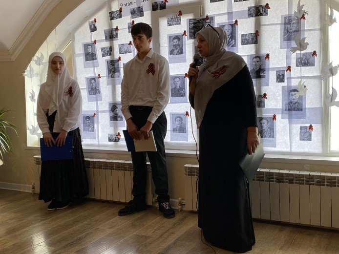 На торжественном мероприятии выступили родственники ветеранов. Преподаватели Акаева Лариса и Амхадова Кемиса рассказали о своих родственниках участниках войн Акаева Даше и Индербиева Магомеде.