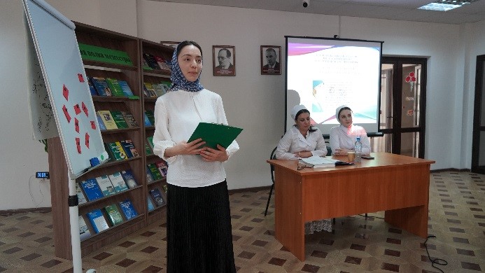 Начиная мероприятие главный библиограф Зарган Ватаева, сказала, что в современном мире, многие профессии заменяют информационными технологиями, но есть такая профессия, которая всегда была и будет и это конечно медицинская сестра. Ведь уход за больными людьми необходим всегда, и никакой робот не справится с этой задачей.