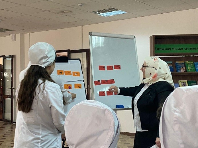 Старшая медсестра Республиканского эндокринологического диспансера Милана Андербековна рассказала об интересных случаях из своей практики, также отметила, что данная профессия требует значительный уровень концентрации внимания, аккуратности, точности, ответственности. Приглашенные гости также ответили на многочисленные вопросы студентов.