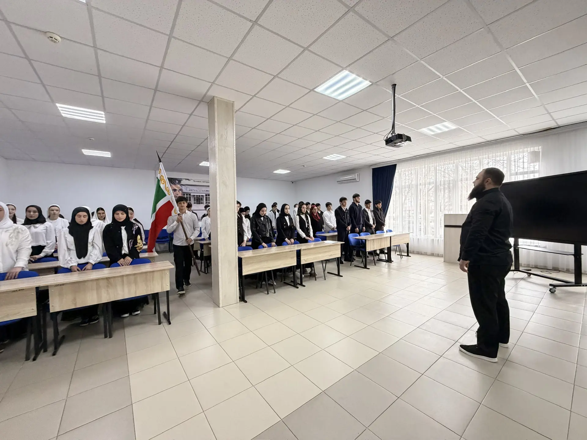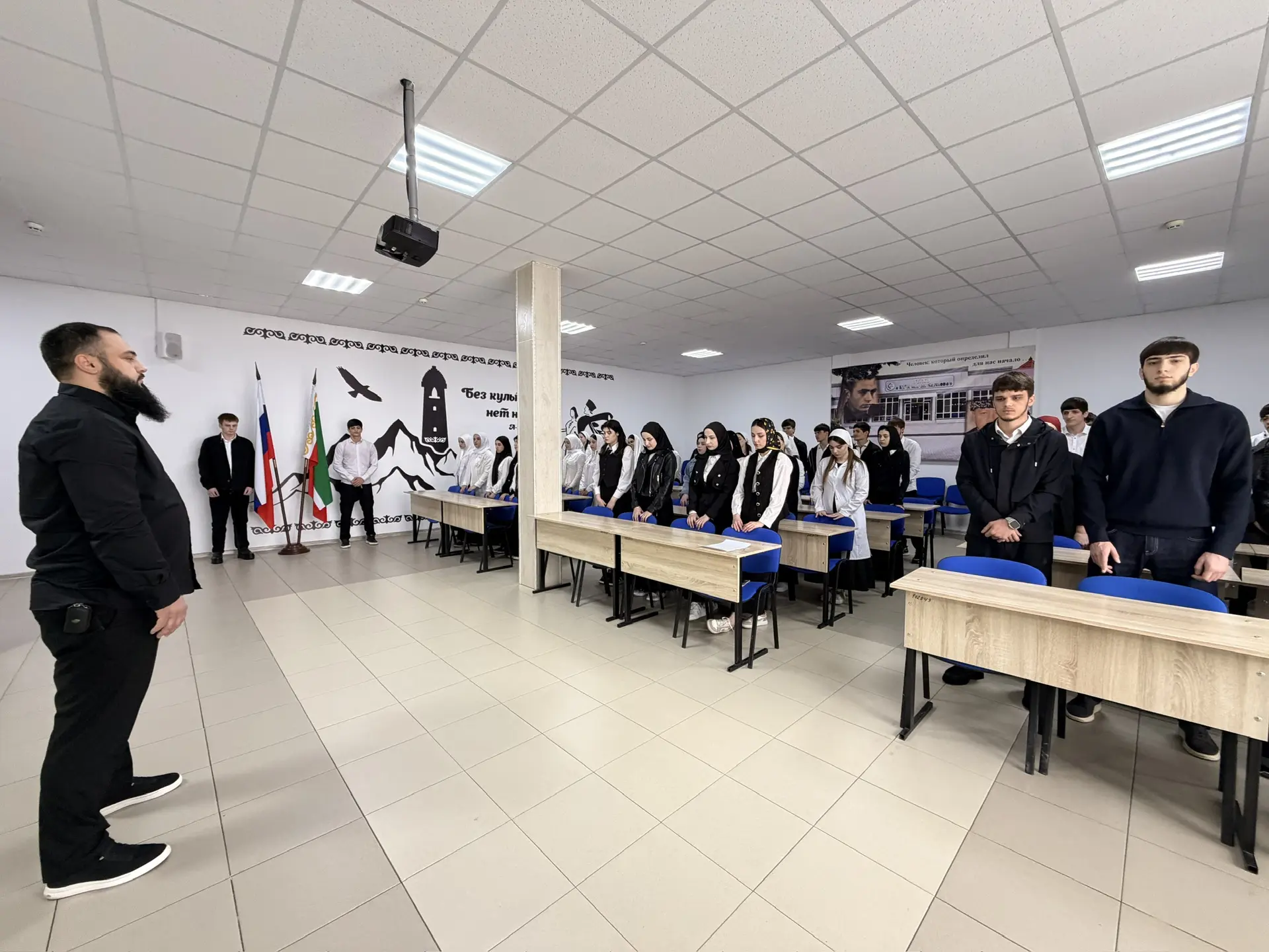 30 марта в ГБПОУ «КГК им. Ш. Калиева» состоялась еженедельная патриотическая акция церемониального выноса флагов РФ и ЧР  и исполнения гимна РФ и ЧР.На церемонии присутствовали студенты, преподаватели и сотрудники колледжа.Особая честь выноса и установления флагов выпала студентам:  Хусиханову Халиду и Бициеву Абдул-Малику.После церемонии студенты отправились на внеурочное занятие "Разговоры о важном". Его темой стал важный для всех возрастов вопрос «Как справляться с волнением?».